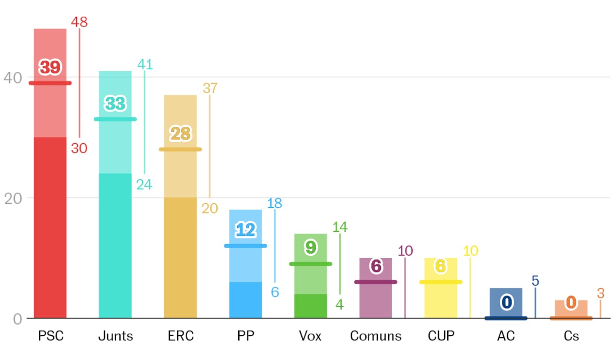 En resumen, hay dos escenarios principales para la noche electoral: que la única suma sencilla sea un acuerdo de izquierdas (con PSC y ERC), o que los republicanos de ERC puedan elegir entre buscar esa opción o perseguir un acuerdo independentista con Junts.