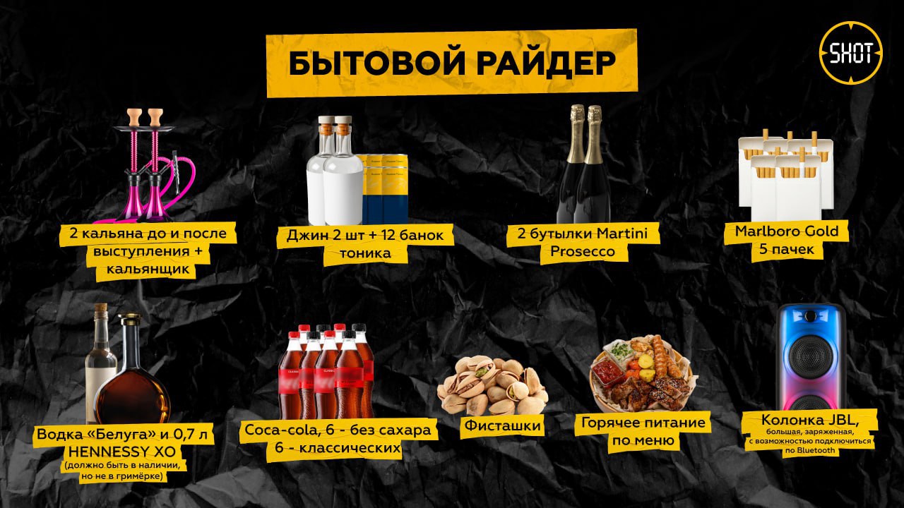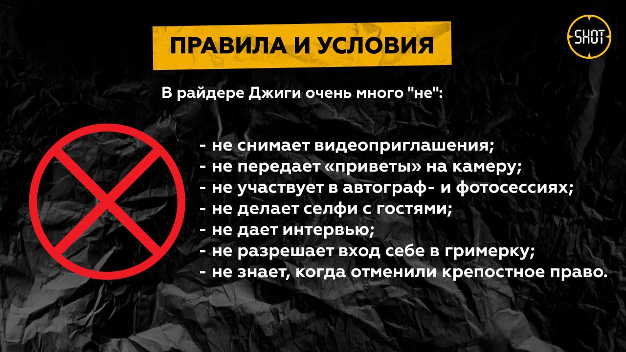 Фоткаться, общаться или записывать «приветы» Джиган категорически отказывается. Предпочитает тихонечко почилить в гримёрке. Туда ему надо принести просекко, водочку, коньяк и 5 пачек сижек. А вот пивчика нет, наверно, предпочитает своё — недавно Джига заявил, что запускает производство собственного пива. Из ЗОЖной жизни позиции в райдере тоже есть: фрукты, овощи и кола без сахара.