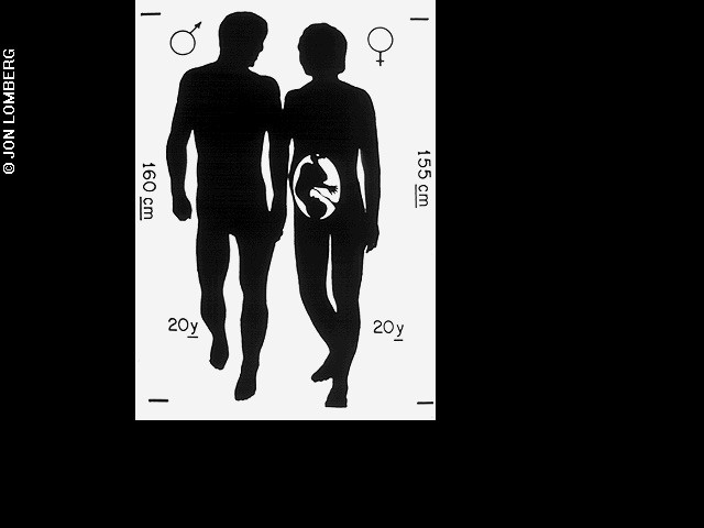 Далее схематично изображены люди разных полов и возрастов, а также младенец в утробе матери и отдельно, с указанием средних размеров. Интересно, что команда Карла Сагана намеревалась поместить фотографию обнаженных мужчины и женщины, чтобы показать, как выглядят люди на самом деле. Однако NASA запретило использовать такое изображение, и от людей на вошедшем в коллекцию изображении остались лишь черные силуэты. Люди стесняются не только друг друга, но и внеземных цивилизаций.