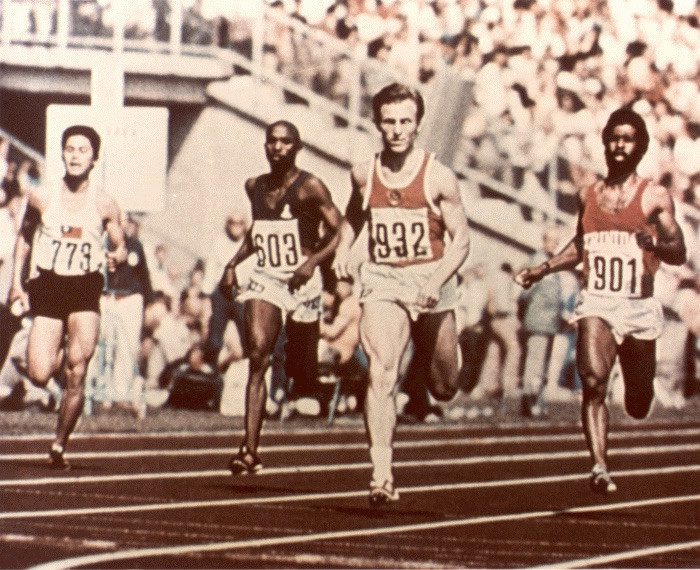 Только потом начинаются цветные изображения, демонстрирующие настоящих людей со всего мира. На втором снимке, где показаны олимпийские спортсмены, первым бежит (третий слева направо) советский легкоатлет Валерий Борзов.