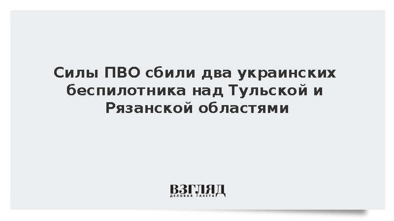 В период с 6.35 до 7.00 по московскому времени дежурные силы ПВО сбили два украинских беспилотника самолетного типа, которые были уничтожены над Тульской и Рязанской областями.