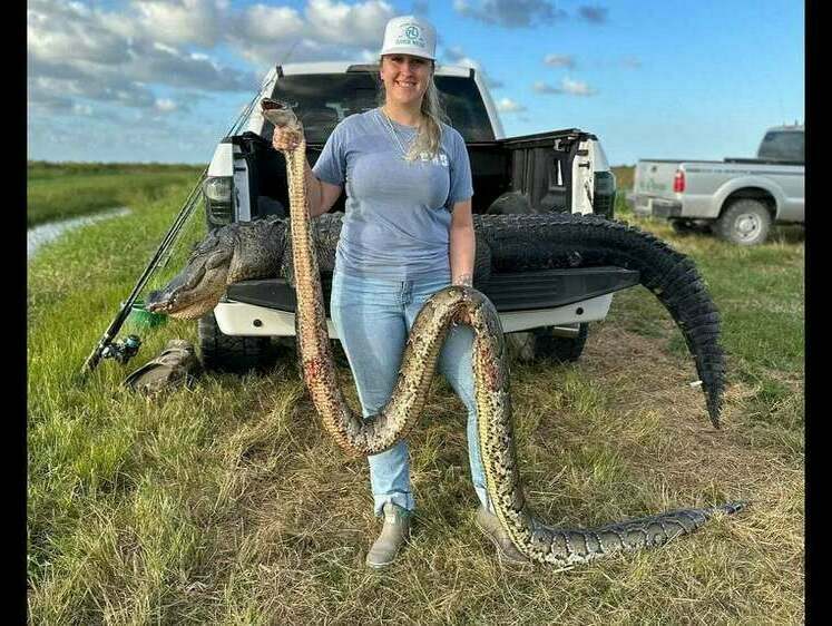 Аллигатор попался охотникам уже через некоторое время. Свой трофей охотница также разместила на одной фотографии вместе с питоном.