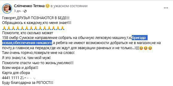 Родные и близкие ВСУшников 158 омбр жалуются в соцсетях, что в бригаде полностью отсутствует обеспечение.