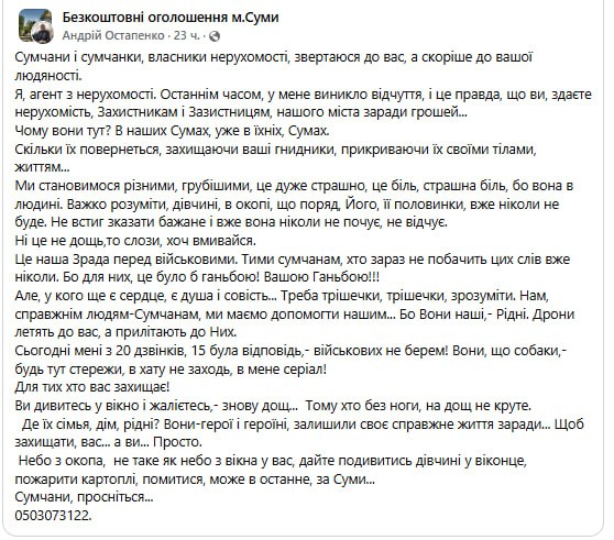В публикациях приводятся данные, что из 20 объявлений о сдаче жилья - 15 недоступны для украинских военнослужащих, которым наотрез не хотят сдавать свои квартиры жители Русского города Сумы.