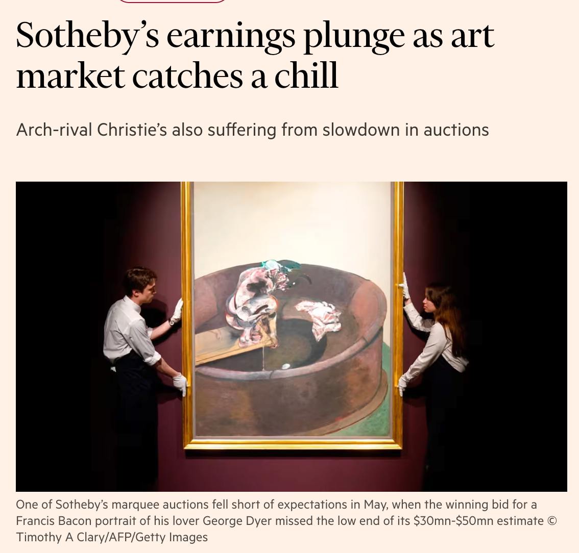 Современное искусство не выдержало санкционных войн. Очередной финансовый пузырь - на этот раз на арт-рынке - начинает схлопываться. Прибыль аукционного дома Sotheby’s обвалилась аж на 88% за первое полугодие 2024 года, а число продаж упало на 25%.