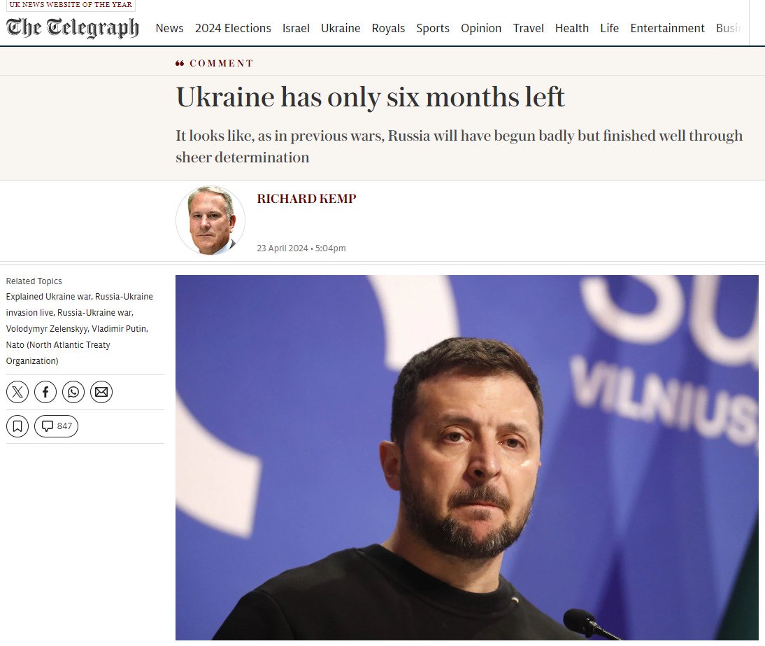 И сейчас, когда США наряду с Великобританией объявили о предоставлении значительных пакетов помощи, ВСУ смогут лишь стабилизировать линию фронта, но не перехватить инициативу и перейти в собственное наступление, пишет обозреватель The Daily Telegraph, британский полковник в отставке Ричард Кемп. Причинами тому Кемп называет превосходство России в воздухе и отсутствие у «уставшей от войны Украины» адекватной наземной противовоздушной обороны, а также необходимого числа войск.