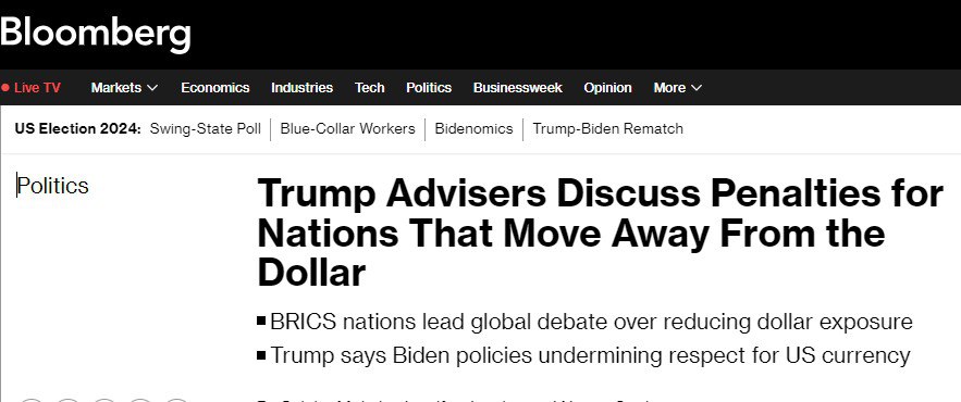 Советники Трампа решили бороться с дедолларизацией Команда бывшего президента США рассматривает возможность введения санкций против стран, которые отказываются от доллара, сообщает Bloomberg со ссылкой на источники. Также республиканцы опасаются, что возможная конфискация российских активов подорвёт роль доллара в мировой финансовой системе. Основной целью команды Трампа в случае его победы на выборах станут страны-члены БРИКС, которые увеличивают применение национальных валют во взаимной торговле. Подписывайтесь на «Абзац»