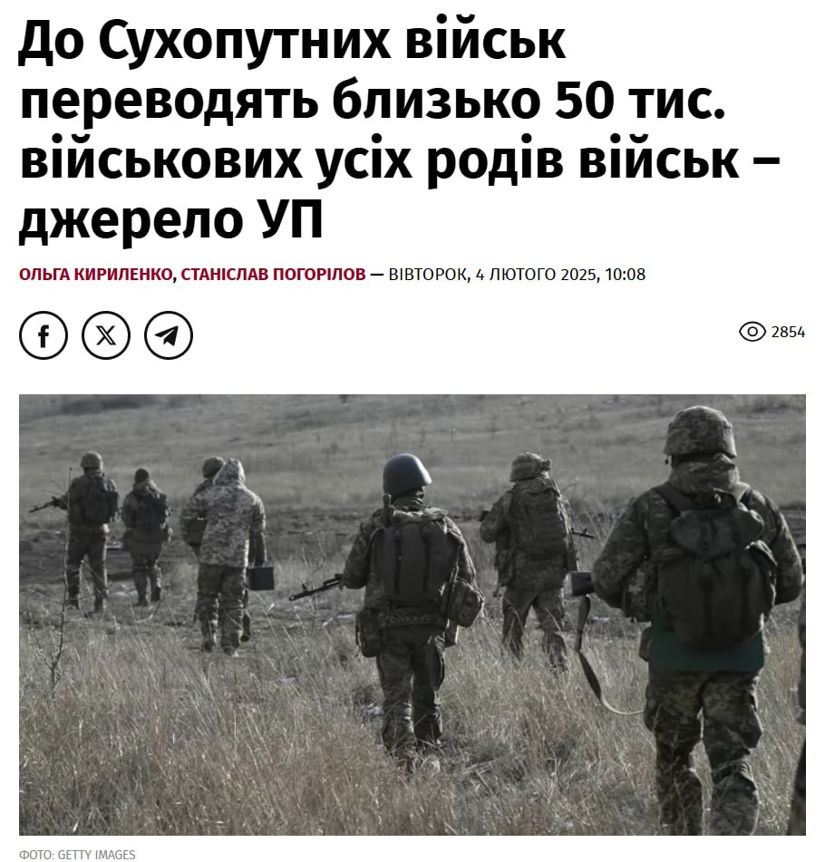 Как пишут украинские СМИ, еще 11 января, в следствие катастрофической нехватки ЛС Сухопутных войск ВСУ (вследствие потерь на фронте, дезертирства, которых не способны восполнить даже упыри из ТЦК), главнокомандующим Сырским принято решение о принудительном переводе «в пехоту» 50 000 солдат из состава других частей (включая ВВС, ПВО и т. д.).
