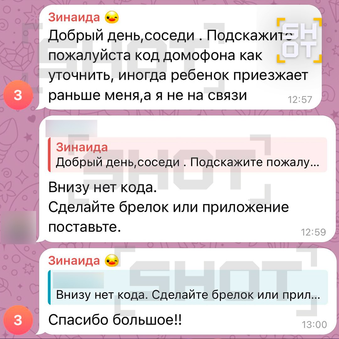 В самом начале февраля Зинаида спрашивала у соседей в общем чате код от двери домофона, которая открывает доступ на территорию ЖК — очевидно, для того, чтобы сообщить его Корбе и тот смог беспрепятственно проникнуть в дом генерала.