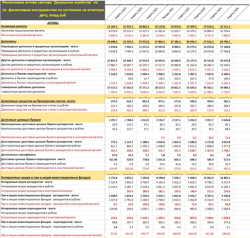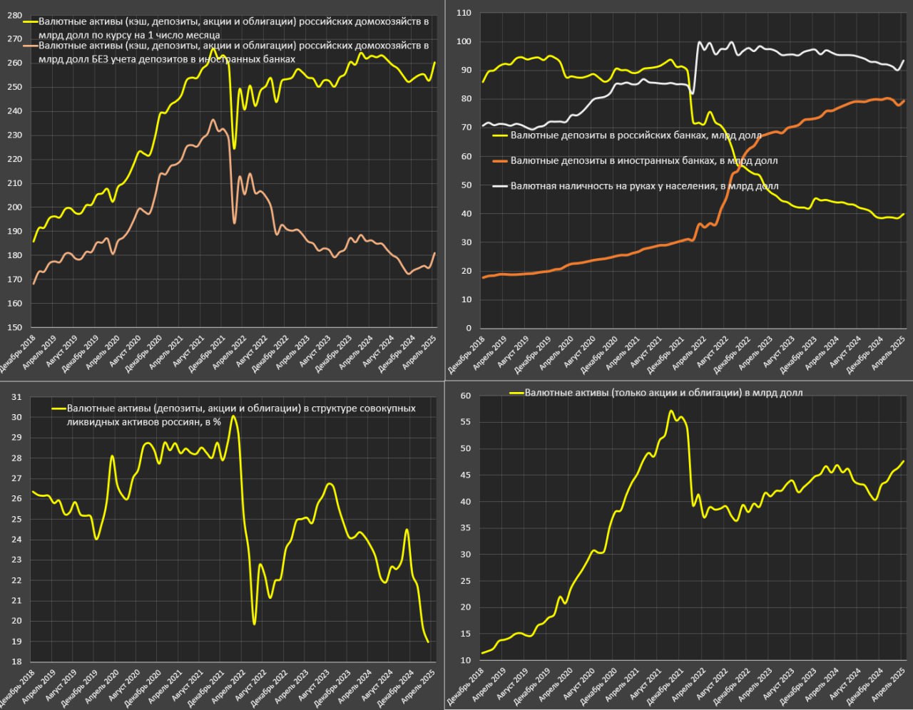 🔘Валютные депозиты в иностранных банках очень активно росли в 2022 (+$31.8 млрд), с меньшими темпами в 2023 ( +$10.8 млрд) и совсем незначительный прирост в 2024 (+6.6 млрд), но с начала 2025 идет небольшое сокращение в пределах $0.5-1 млрд.