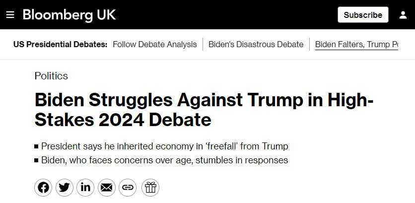 🔺Bloomberg: «Выступление Байдена отличилось грубыми ошибками, повторными репликами, кашлем, ложными заявлениями и длительными паузами, которые вызвали опасения по поводу физической формы и умственных способностей президента».