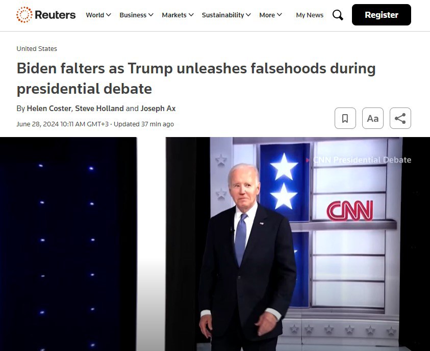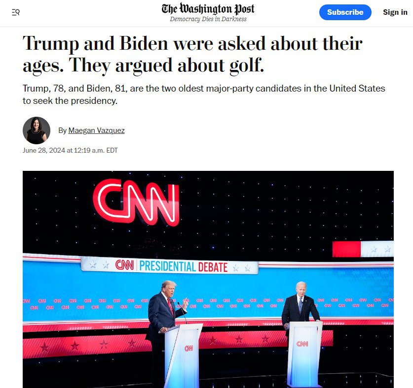 🔺The Washington Post: «Вопросы о преклонном возрасте президента Байдена и бывшего президента Дональда Трампа были в центре внимания во время дебатов. Однако их ответы на вопросы о возрасте переросли в личные оскорбления и несуразную перепалку о любимом многими пенсионерами виде спорта – гольфе».