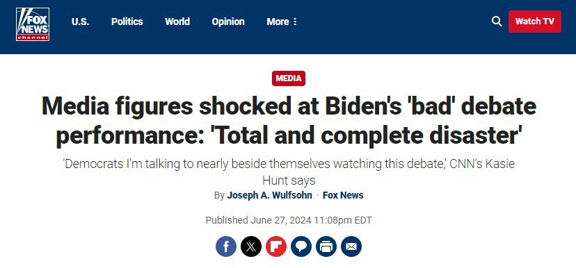 🔺Fox News: «Представители СМИ испытали шок и ужас из-за выступления президента Байдена на дебатах. Многие выдвигают идею исключить его из списка кандидатов от Демократической партии и убрать из Белого дома прямо сейчас».