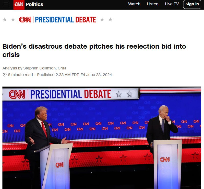 🔺CNN: «Если Джо Байден проиграет выборы в ноябре, история зафиксирует, что для уничтожения его президентства потребовалось всего 10 минут эфирного времени».