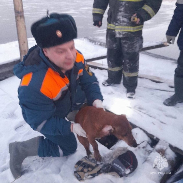Сотрудник МЧС Карелии спасли упавшую в ледяное озеро собаку