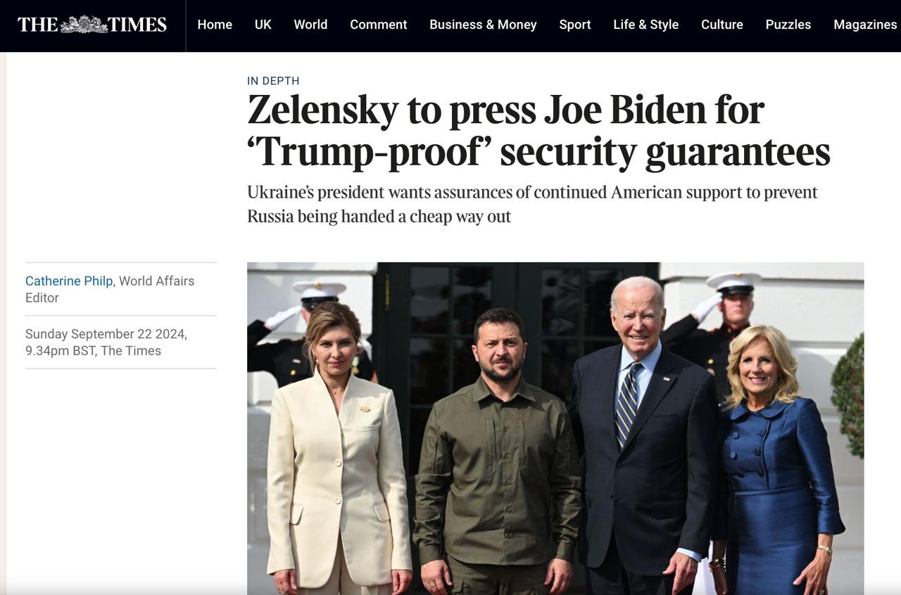 Зеленский, по данным издания, намерен давить на Байдена для получения гарантий безопасности, «не поддающихся Трампу». То есть такие, чтобы Трамп в случае своей победы не мог заставить Киев заключить мирное соглашение на условиях, которые Киев сочтет невыгодными.