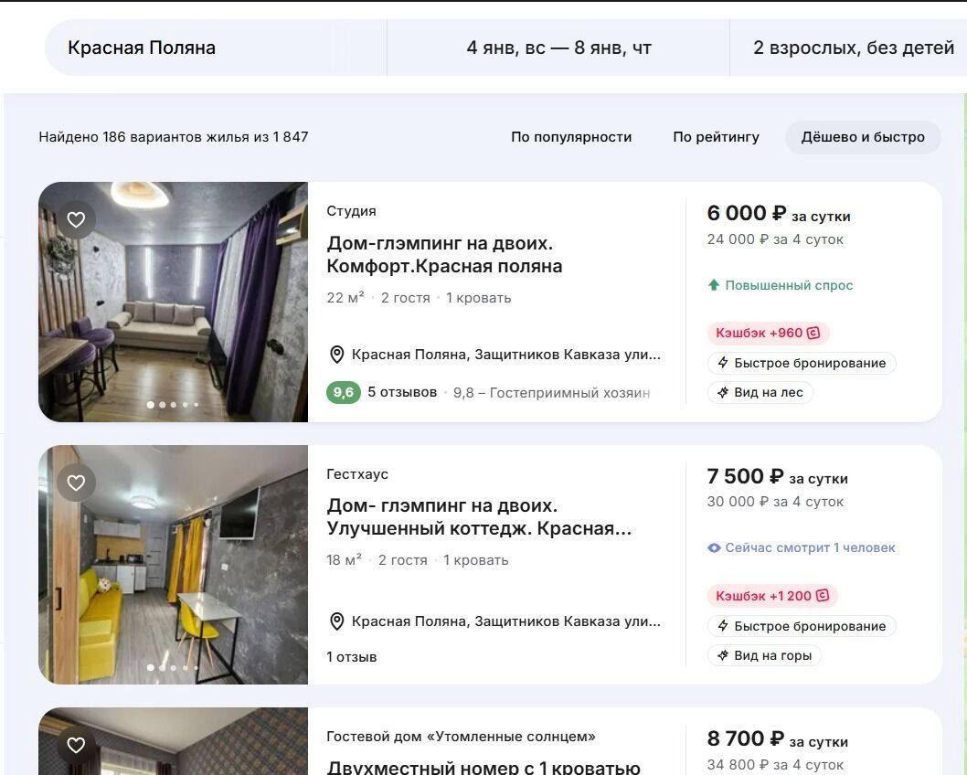Апартаменты или однокомнатная квартира в поселке Эсто-Садок на 4 дня выйдут в 35-45 тысяч рублей (9-12 тысяч рублей за сутки). Если рассматривать Розу Хутор, то здесь еще можно найти неплохие варианты дома-глэмпинга на двоих — 25-30 тысяч рублей на 4 дня.