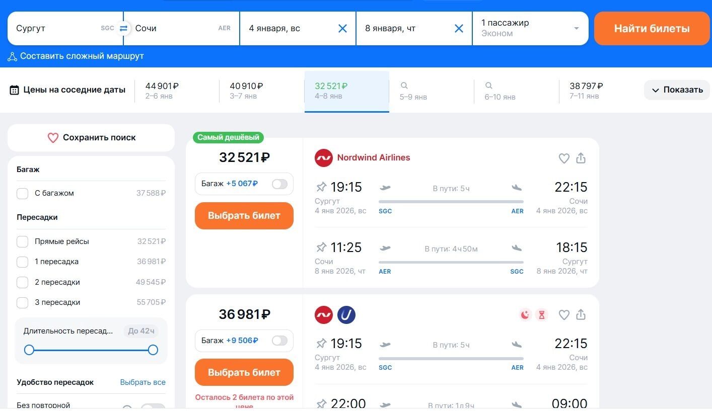 Теперь глянем, какие затраты понесут отдыхающие из ХМАО. Если смотреть стоимость перелета из Сургута до Сочи и проживание в районе Эсто-Садок, то авиабилеты с 4 по 8 сентября (самые дешевые билеты) на одного туда-обратно без багажа обойдутся в 32,5 тысячи рублей.
