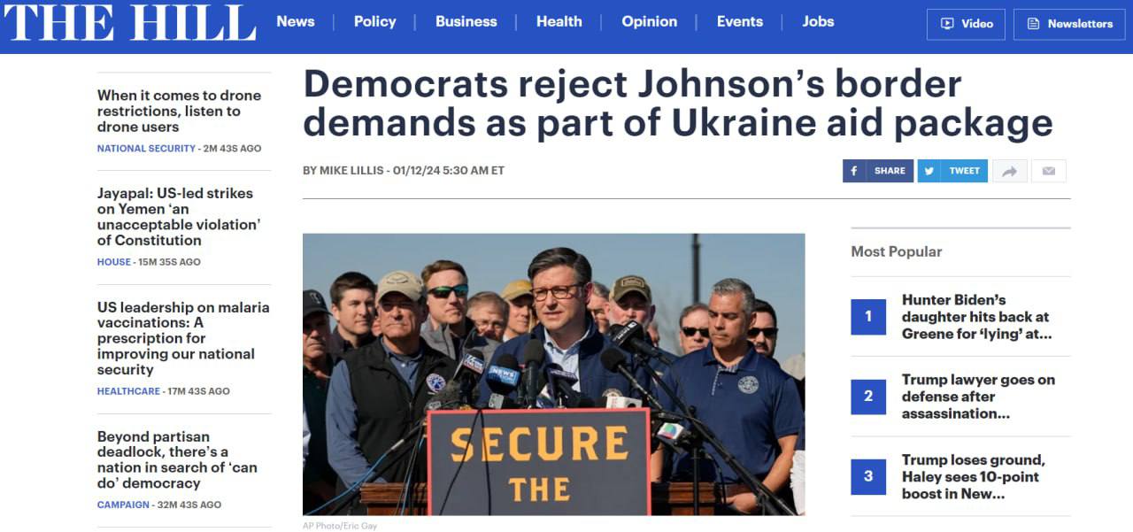 Демократы Палаты представителей отклонили требования спикера Майка Джонсона о новых строгих мерах безопасности границ в обмен на помощь Украине.
