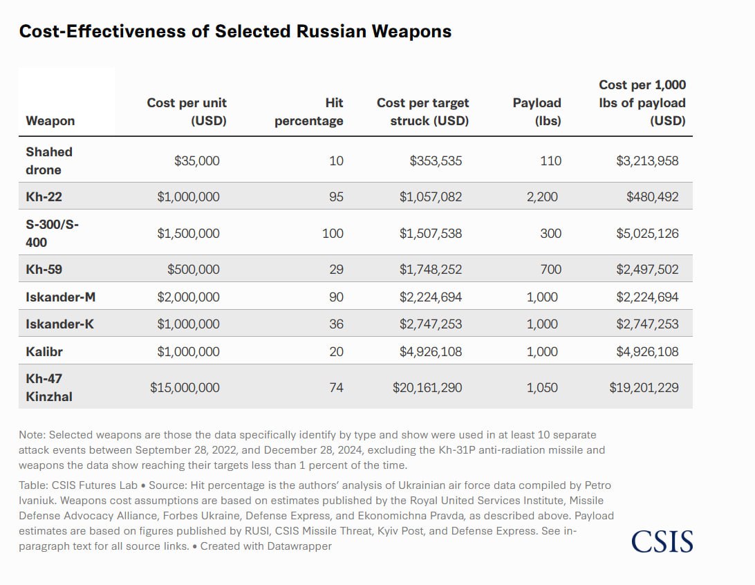 Далее CSIS приводит инфографику, которая позволяет оценить интенсивность использования «Гераней» (их именуют «Шахидами») и ракетного вооружения. И получается недвусмысленный вывод, что даже на данном этапе войны проведение массированных ударов обходится дешевле, чем для Украины отражение этих самых ударов.