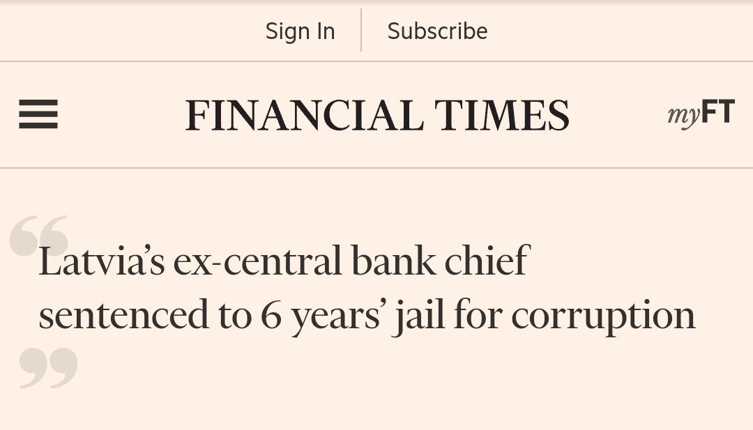 Бывший глава центробанка Латвии Илмарс Римшевич приговорен к шести годам лишения свободы и конфискации активов за коррупцию.
