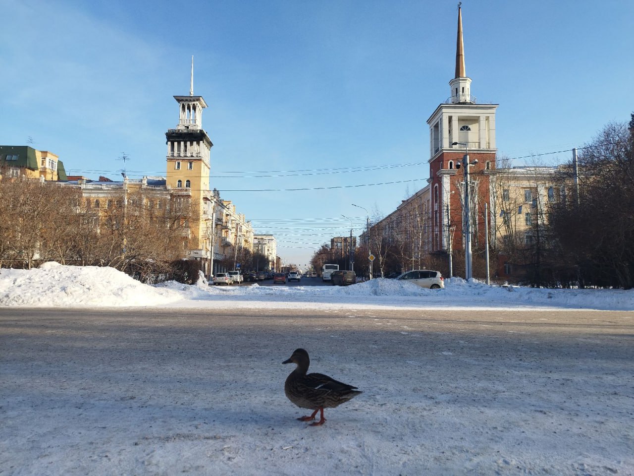 Утки в Красноярске чувствуют себя полноценными членами общества. Вот одна из них свободно гуляет по Красной площади, совсем не боясь проходящих мимо людей.
