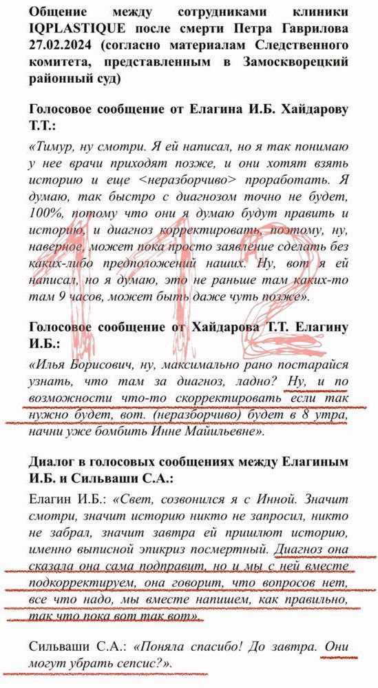Жена погибшего продюсера Петра Гаврилова опубликовала расшифровку переписки бариатрического хирурга Ильи Елагина с Тимуром Хайдаровым и его супругой.