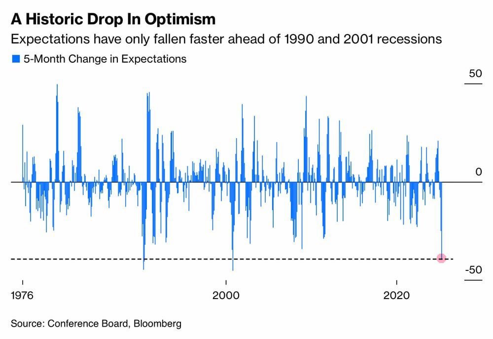 В США наблюдается одно из сильнейших в истории падений потребительского доверия к экономике. Исторически, такие сильные падения почти всегда наблюдались перед рецессиями.
