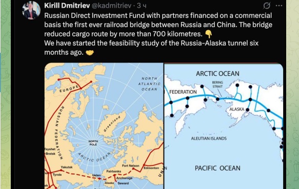 «Российский фонд прямых инвестиций вместе с партнёрами на коммерческой основе профинансировал первый в истории железнодорожный мост между Россией и Китаем. Благодаря ему маршрут грузоперевозок сократился более чем на 700 километров. Мы уже шесть месяцев ведём технико-экономическое обоснование (ТЭО. — EADaily) строительства тоннеля Россия — Аляска», — пишет Дмитриев, которого цитирует телеграм-канал «Прямой эфир».