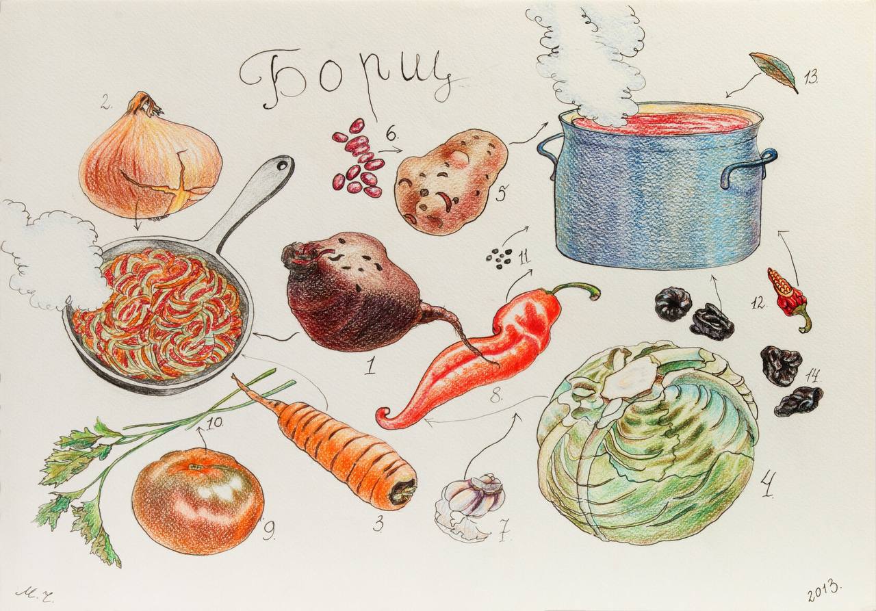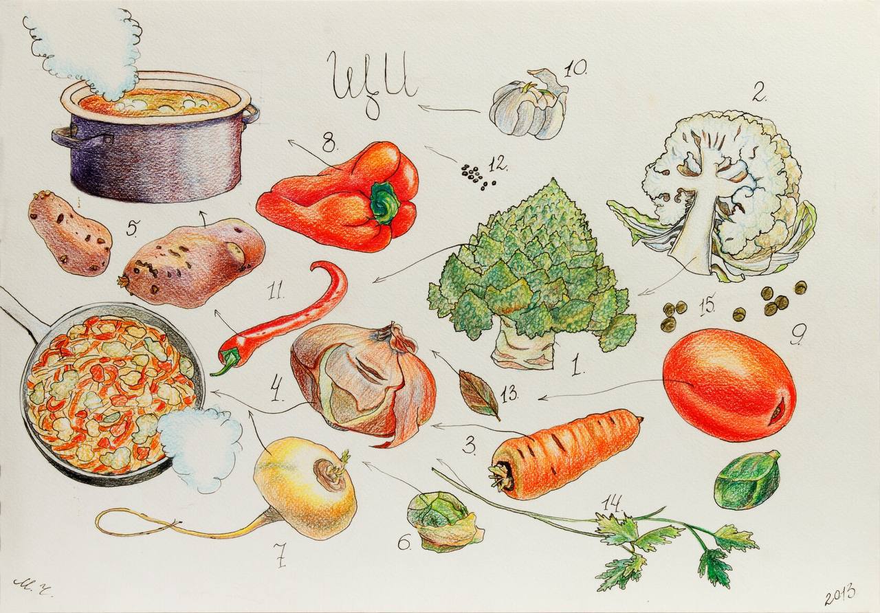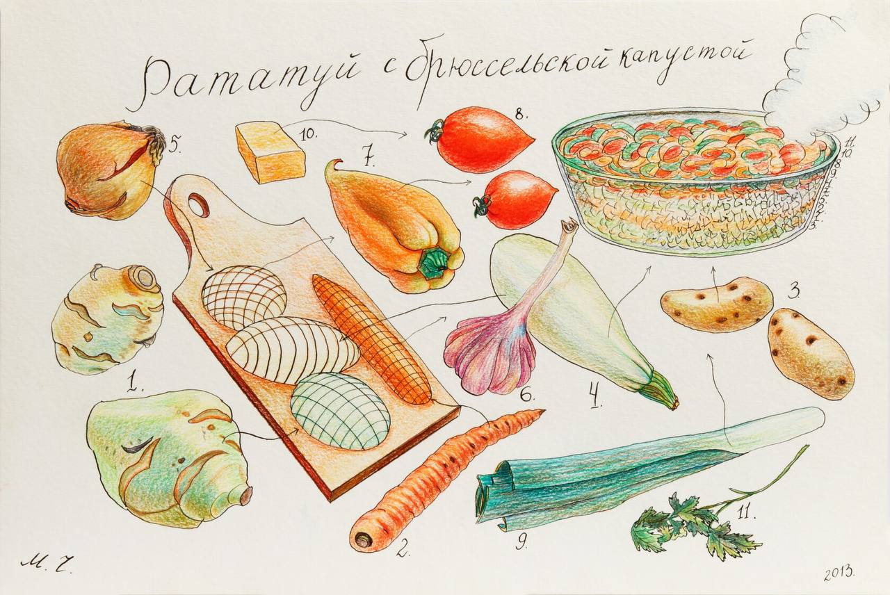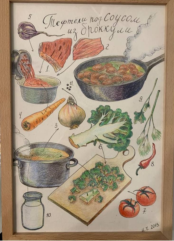 Художница создала серию картин с едой («Борщ», «Щи», «Рататуй с брюссельской капустой, «Тефтели под соусом из броккули»). Работы выполнены в стиле картинок из советских книг для детей.
