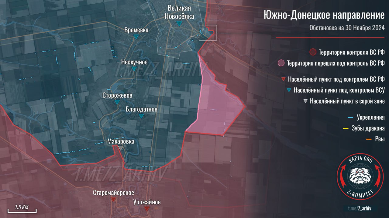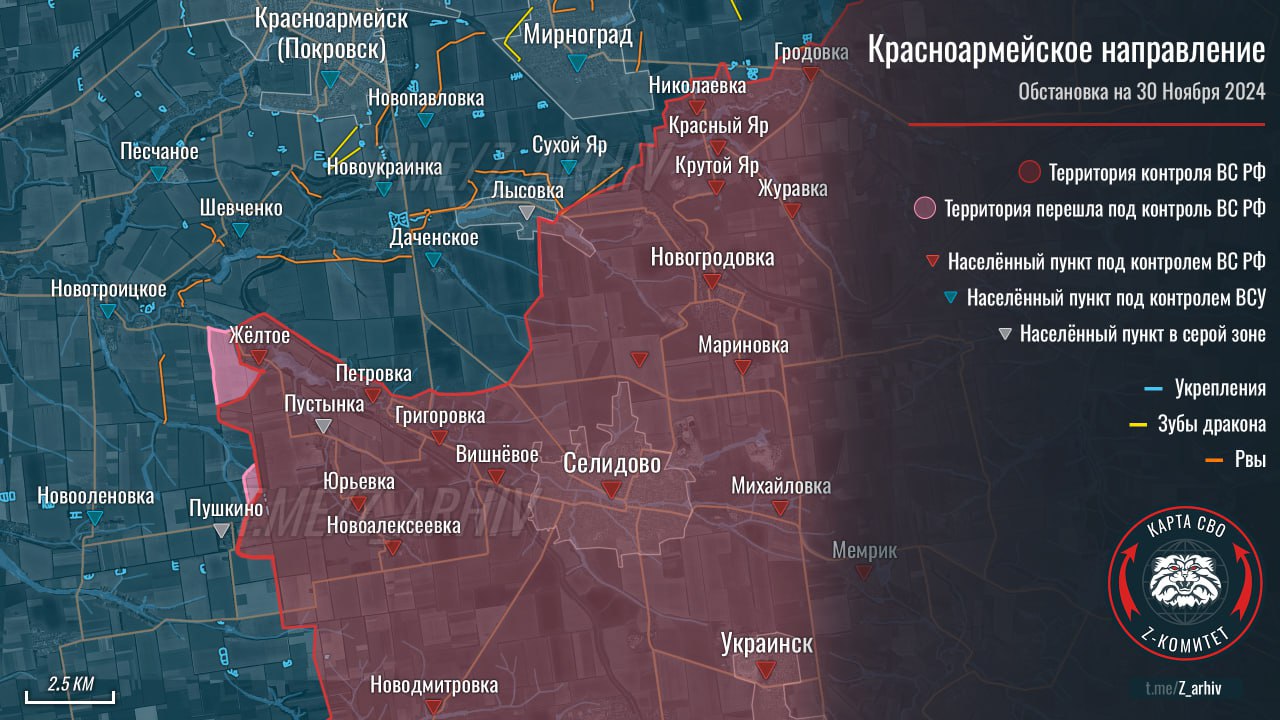 2. Продвижение ВС РФ, после освобождения Желтого, в направлении Новотроицкого. Так же идут бои за контроль над н.п. Пушкино