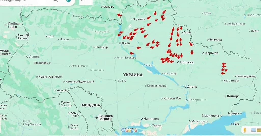 Около 21:00 по Москве украинские каналы сообщали об около 60 БпЛА (схема), затем их число стало расти. Позже сообщалось о примерно 90 единицах.
