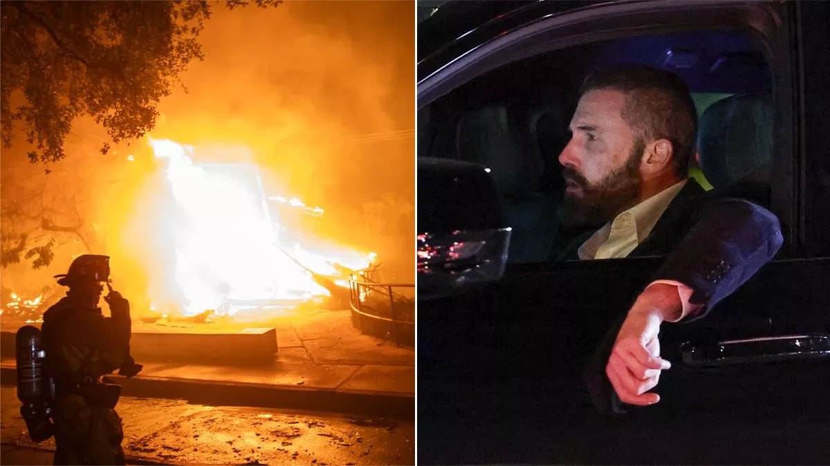 Испуганного актёра Бена Аффлека засняли в тот момент, когда он подъезжал к своему особняку, охваченному огнём в Лос-Анджелесе.