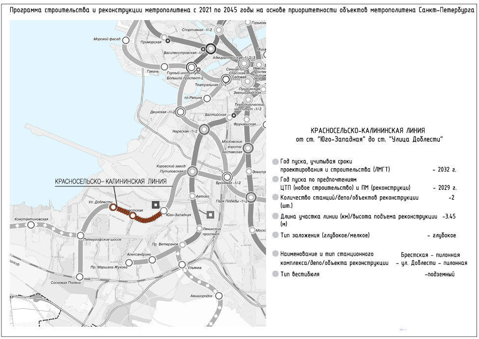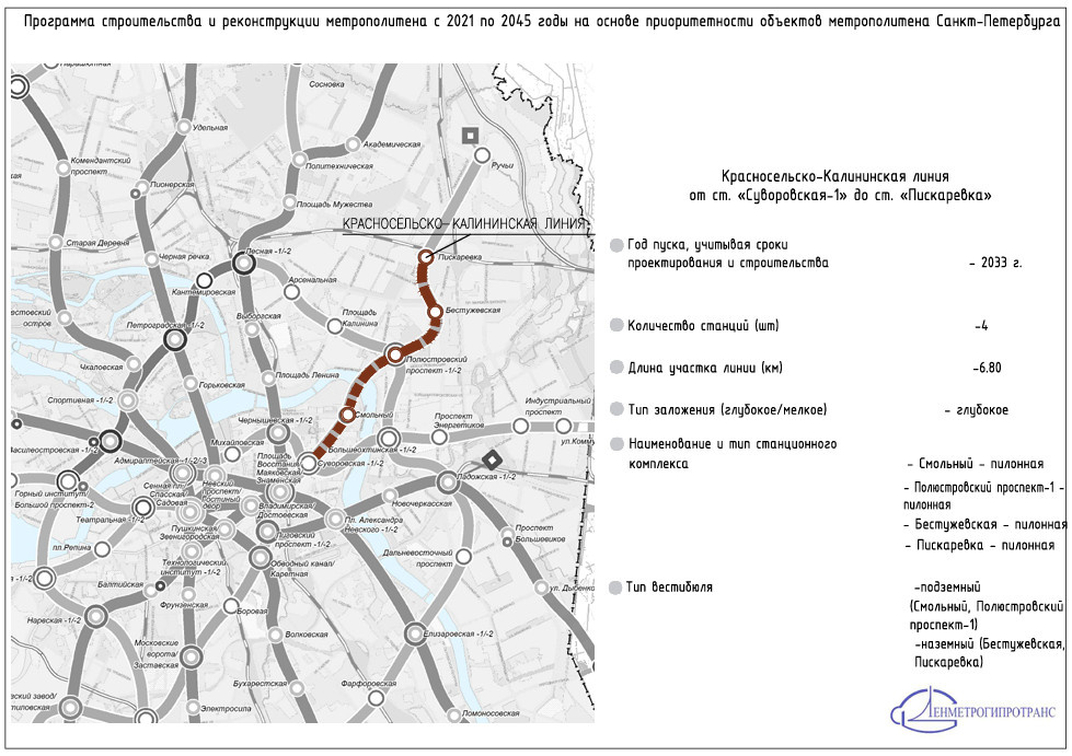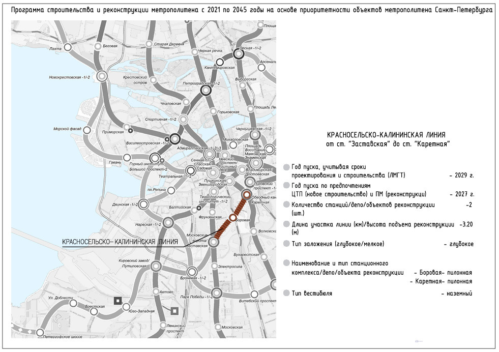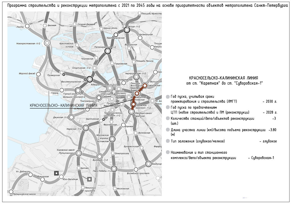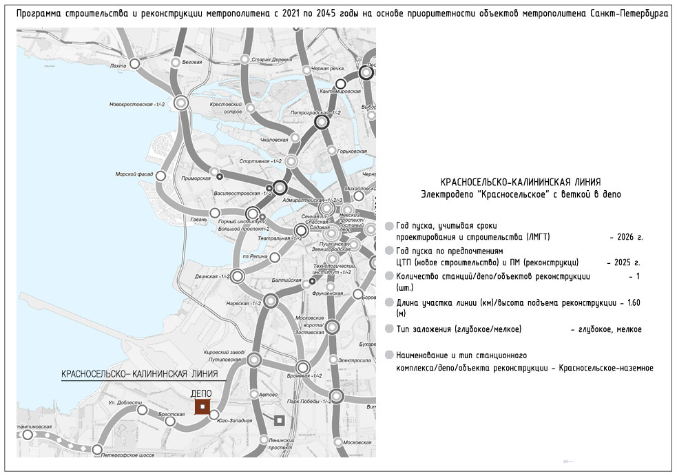 Первый участок Красносельско-Калининской линии метро «Казаковская» — «Путиловская» планируют достроить в 2024 год, хотя пересадка с «Путиловской» на «Кировский завод» заработает только в 2025-м. Готовится проходка четырьмя проходческими щитами следующего участка от «Путиловской» до «Каретной». При этом идет проектирование и противоположного отрезка — от «Казаковской» до «Сосновой поляны». За «Каретную» линия пойдет к «Полюстровской-1» (через «Суворовскую-1») и далее до станции «Ручьи», где тоже должно появиться одноименное депо.