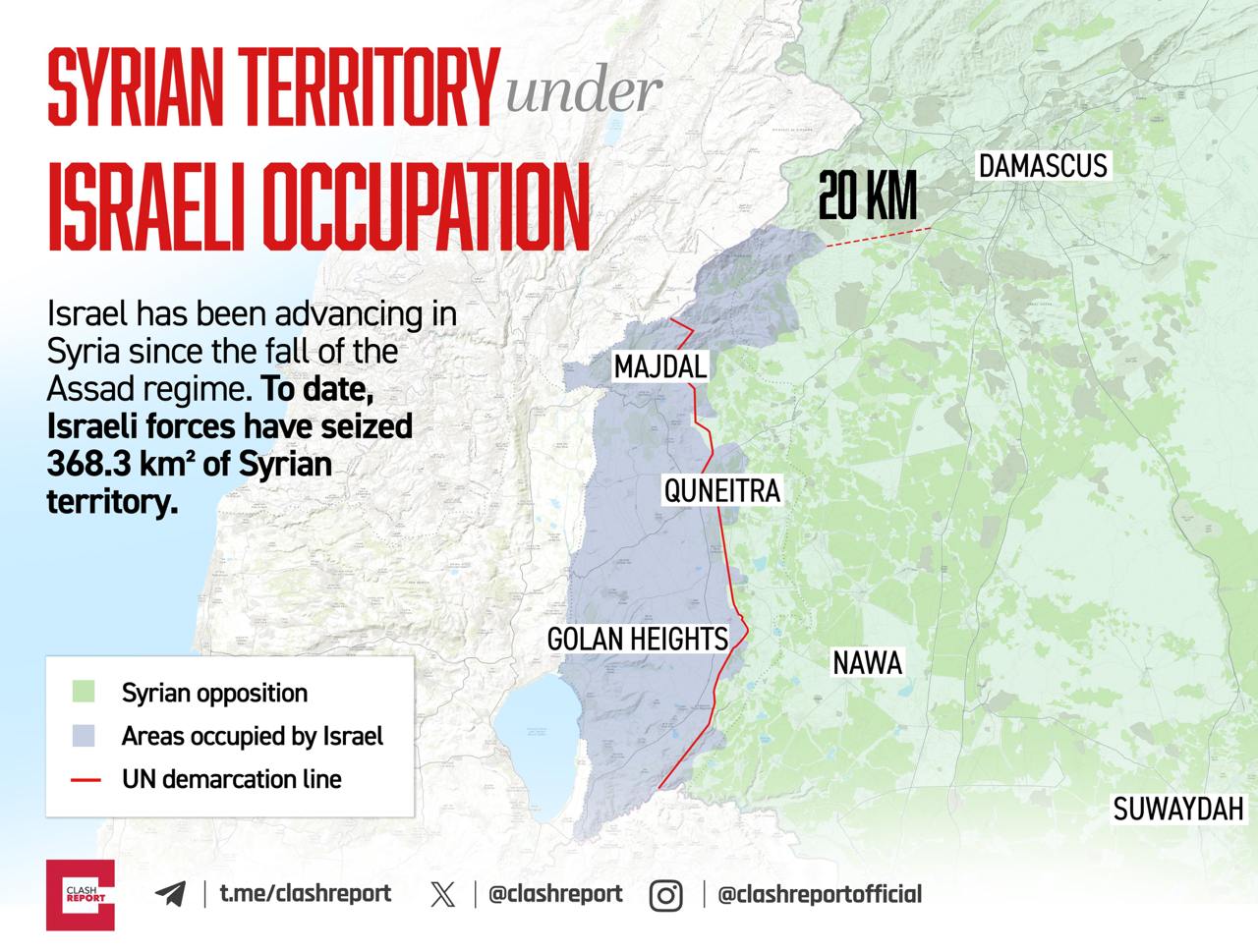 Израиль захватил 368,3 км² сирийской территории. Солдаты ЦАХАЛ сейчас находятся менее чем в 20 км от Дамаска, столицы Сирии.