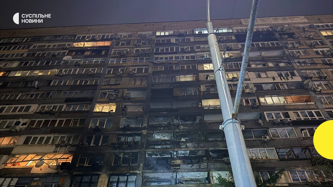 В Печерском районе обломки беспилотника попали в многоэтажный жилой дом, где возник пожар — горели квартиры сразу на нескольких этажах. В Голосеевском районе повреждены фасад и окна на пятом этаже десятиэтажного здания, во дворе загорелись автомобили.