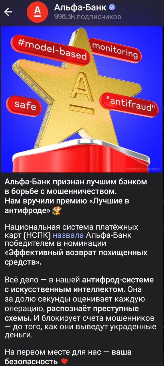 «Альфу» опять ловят на обмане: на этот раз сммщики компании заявили, что банк «признан лучшим в борьбе с мошенниками». НСПК действительно отметил организацию премией «Лучшие в антифроде», однако в списке лауреатов этой номинации «Альфа» — не единственный победитель.