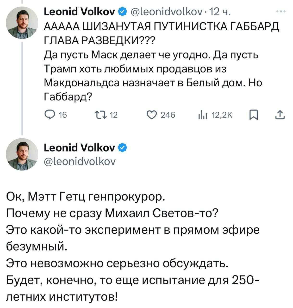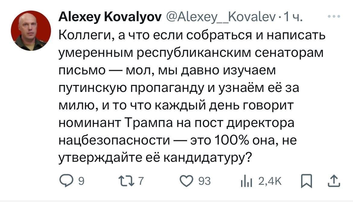 Забавная истерика по поводу назначения Габбард на пост директора национальной разведки США в среде российских коллаборантов. Шаблоны трещат.