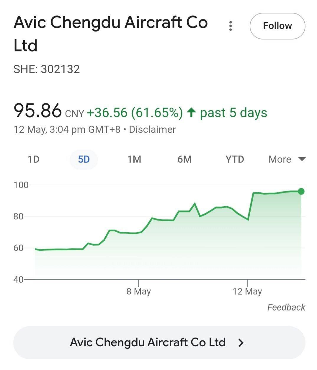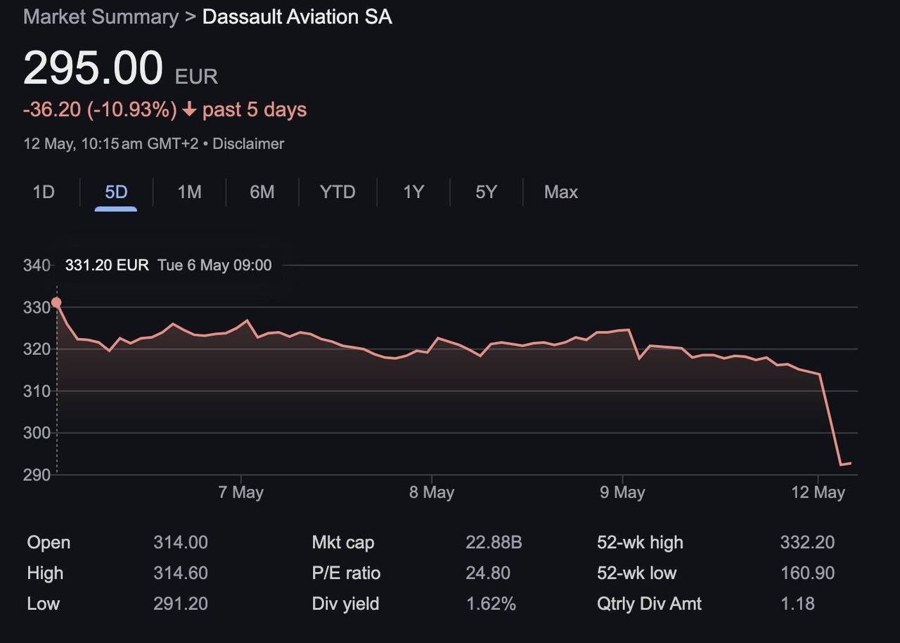Наглядные итоги военного конфликта между Индией и Пакистаном в поведении акций производителя сбитых французских самолётов Rafale и Mirage и производителя китайских истребителей, сбивших французские истребители (за последние 5 дней):