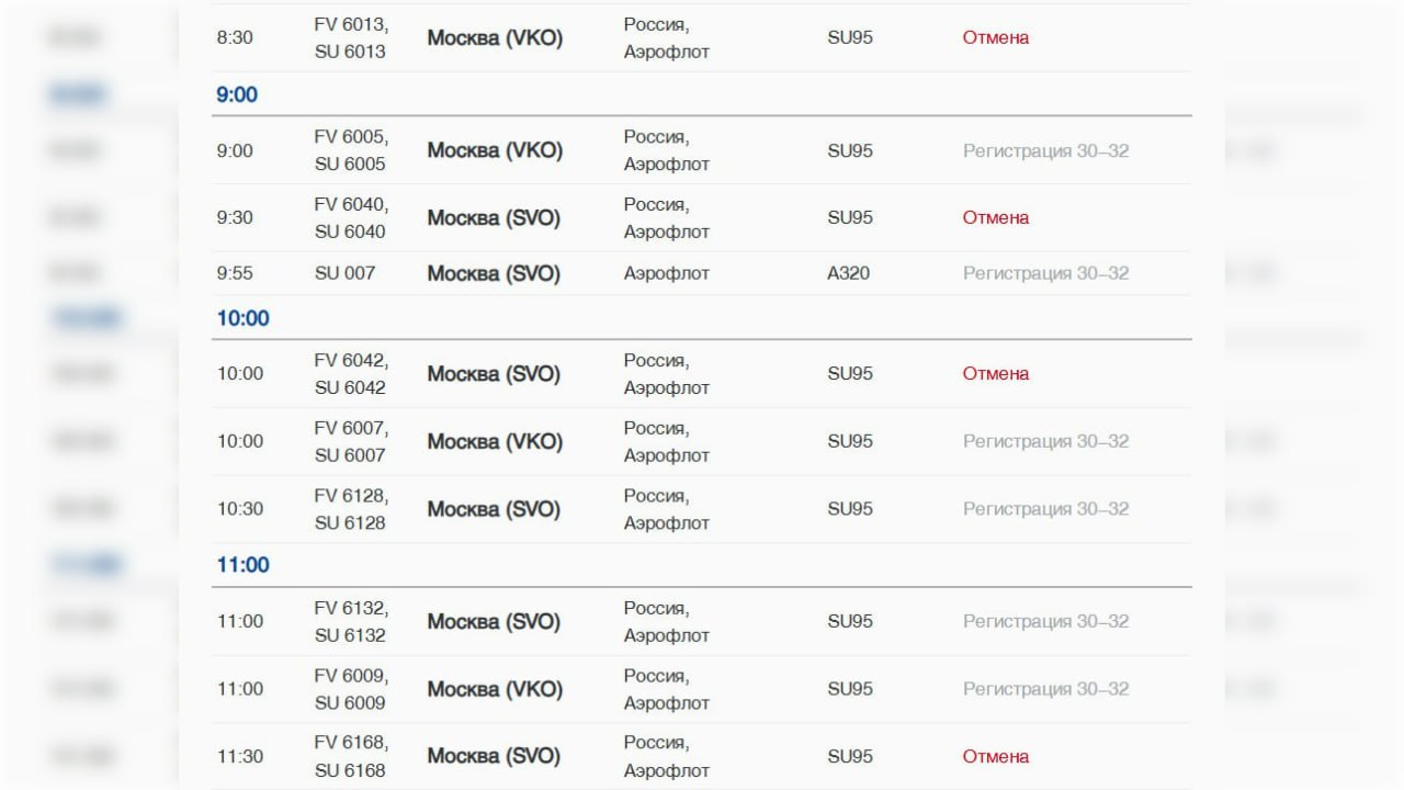 Среди таких рейсов оказались: FV 6013, FV 6040, FV 6042, а также FV 6168 и ряд других. Первая отмена назначена на 08:30, а последняя — 23:55.