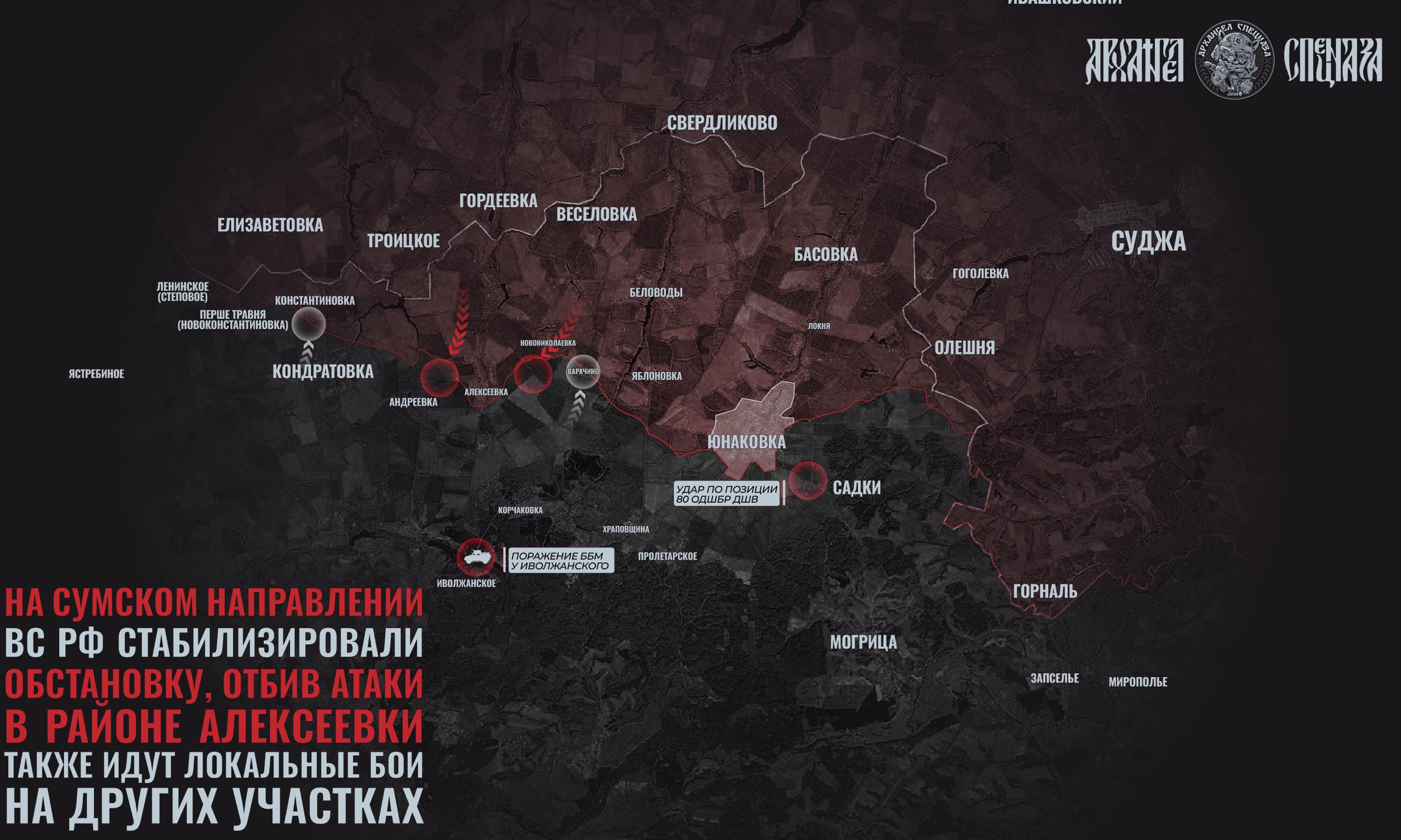 На Сумском направлении ВСУ активно пытались вклиниться в районе Алексеевки с двух сторон, но наши подразделения провели контратаку и отбили основные попытки. Сейчас обстановка стабилизировалась, новых заходов не отмечено. При этом идет зачистка остатков разрозненных групп у села.