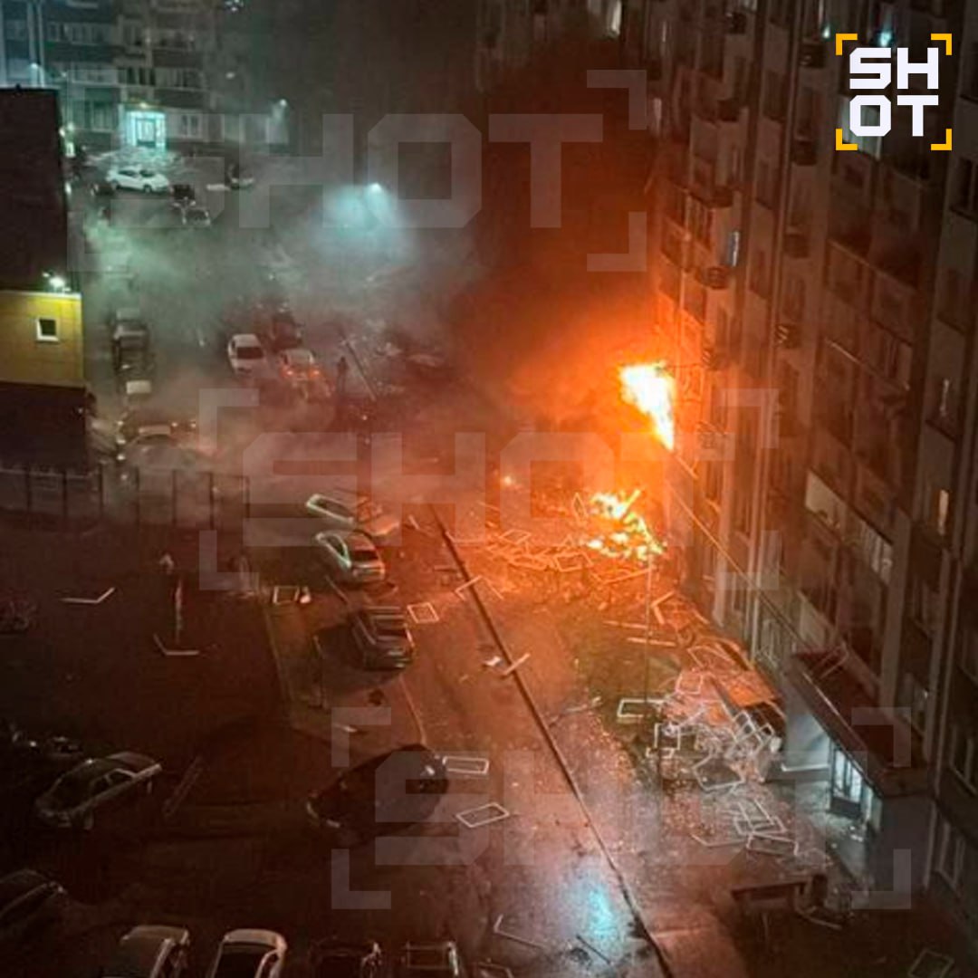 Местные жители рассказали SHOT, что всего было слышно 5-6 взрывов в разных частях города. Затем на западе Твери увидели дым от пожара. Один из БПЛА ВСУ врезался в первые этажи многоэтажного дома. Повреждено минимум 4 квартиры, и обломками побиты автомобили.