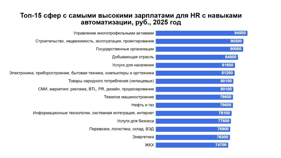 Анализ по отраслям показывает, что самые высокие зарплаты в HR-вакансиях с навыками автоматизации наблюдаются в компаниях по управлению многопрофильными активами — 94 500 рублей, строительстве — 90 500 рублей, добыче — 84 800 рублей и секторе услуг для населения — 81 600 рублей.