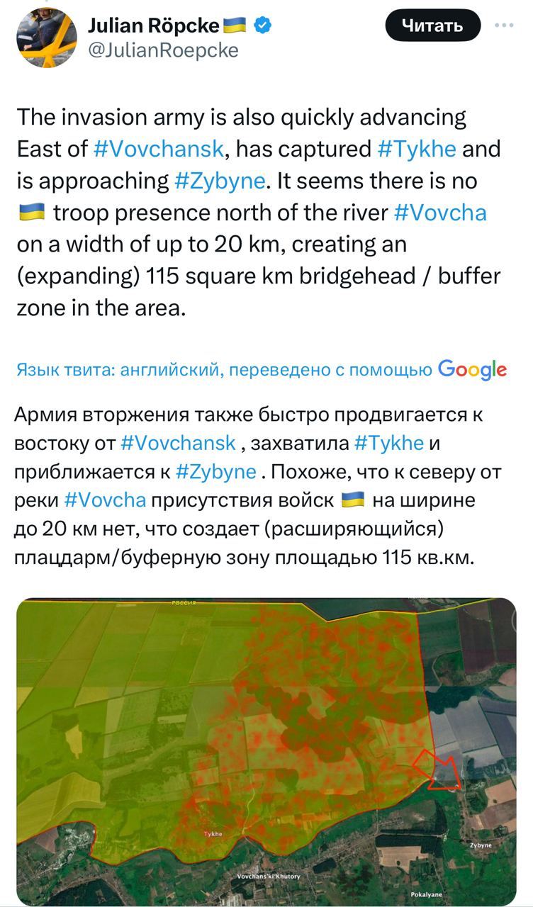 Рёпке пишет, что ВС РФ продвигаются к востоку от Волчанска к н/п Тихое и Зыбино.