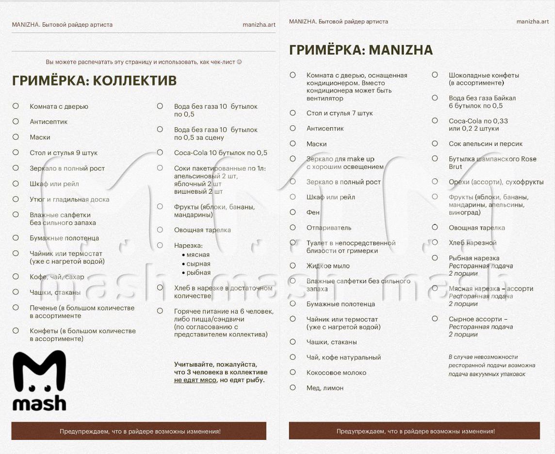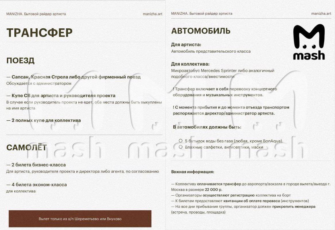 Из радостей теперь только корпоративы. Один стоит 1,5 миллиона рублей (в 2022 году, кстати, был 1 миллион). По райдеру: перелёт с ребёнком и продюсером бизнес-классом, команде — эконом. Под пятую точку — авто представительского класса. Номер в отеле обязательно люкс/полулюкс, охранник на площадке. В гримёрке: две тарелки мясного и сырного ассорти, кокосовое молоко, бутылка шампанского Rose Brut, конфеты и печенье в "большом количестве". На десерт — право отменить выступление, если что-то не выполнено.