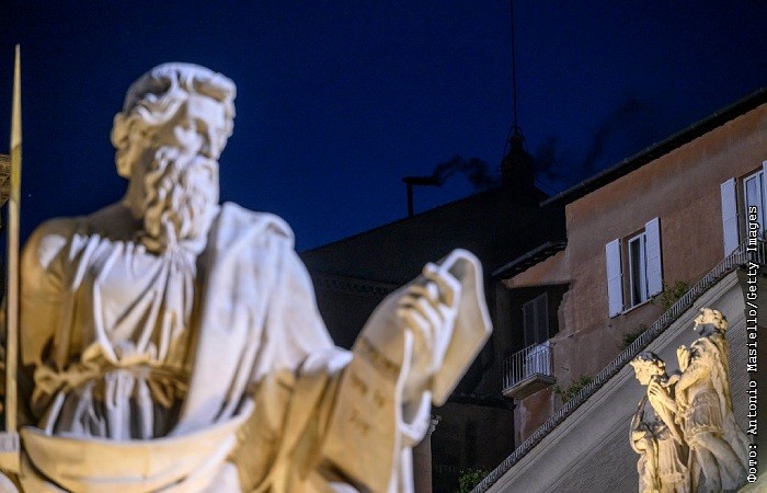 Из дымохода, специально установленного в капелле, пошел черный дым, который свидетельствует о том, что понтифик пока не избран.