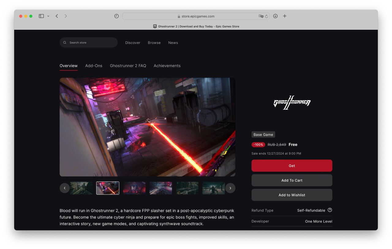 Epic Games Store бесплатно раздают Ghostrunner 2. Это слешер в стиле киберпанк — нарезаем врагов в замедленной съемке под синтвейв-музыку.