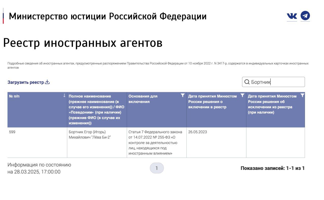 В обновлённой версии реестра Бортник указан в списке с уточнениями — Бортник Егор (Игорь) Михайлович, «Лёва Би-2». Как нам стало известно, общественники из движения «Сорок сороков» обратились в Прокуратуру Москвы с требованием заблокировать счета компании Игоря Бортника, так как полученные деньги уходили на поддержку ВСУ.