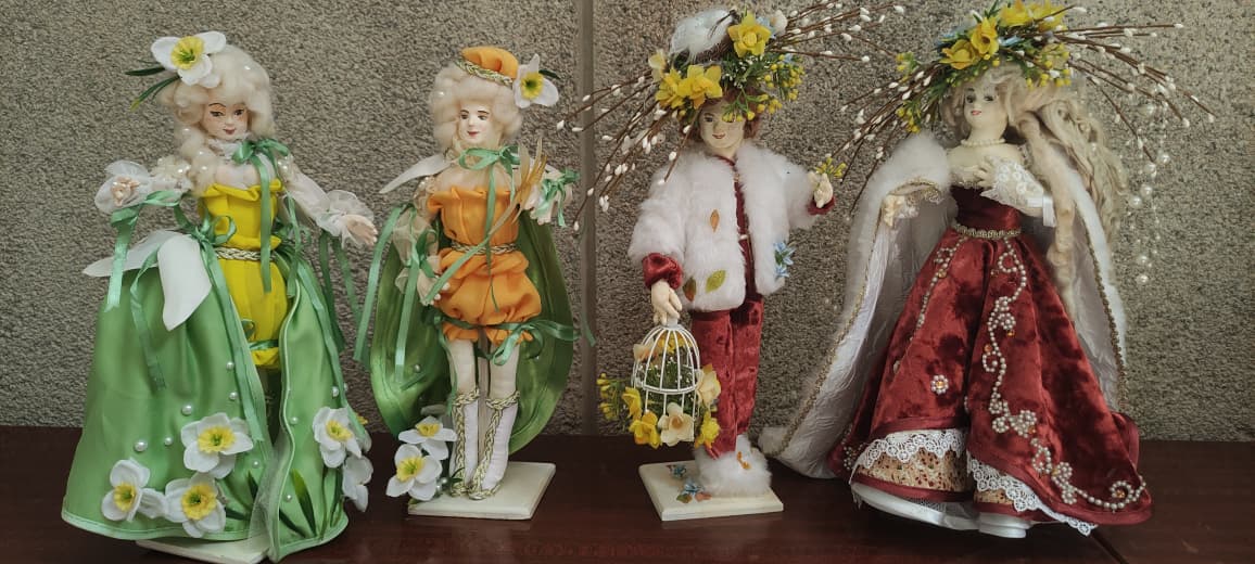 На экспозиции представлены 2 коллекции кукол: Венецианский карнавал" и "Весна". Дамы и кавалеры в карнавальных костюмах 18 века. Камзолы, чулки, треуголки у кавалеров и пышные платья с множеством украшений у дам.