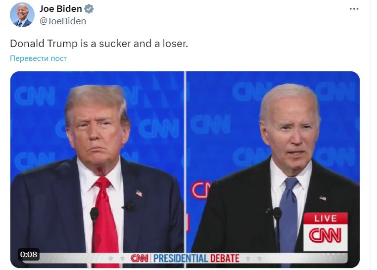 Дональд Трамп — неудачник и лузер. Такое сообщение появилось на странице Байдена в соцсети Х во время дебатов.